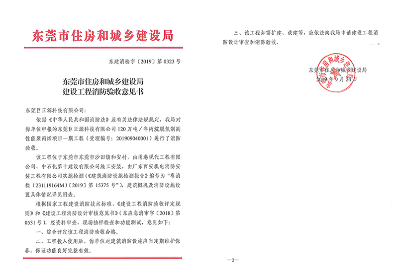 對工程建設而言,消防驗收是竣工使用前的最后一道程序,針對性強、綜合性復雜。特別是近期的行政審批改革后,消防驗收劃入東莞市住房和建設局的職能,驗收環節更為苛刻。為確保聚丙烯項目一期工程順利通過消防驗收,巨正源科技公司高度重視、精心組織,調集各專業室對廠區存在的消防安全隱患進行自查自糾,嚴把質量關、安全關,切實解決各種疑難雜癥,全力推動消防驗收工作。經資料審查、現場抽樣檢查和功能測試,驗收組對聚丙烯項目一期工程給予充分肯定,一致同意通過此次驗收,并出具消防驗收意見書。