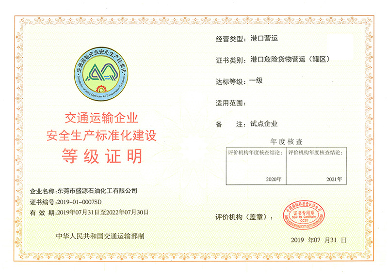 日前,巨正源所屬盛源石化、鴻源碼頭正式獲得由國(guó)家交通運(yùn)輸部頒發(fā)的“交通運(yùn)輸企業(yè)安全生產(chǎn)標(biāo)準(zhǔn)化建設(shè)一級(jí)達(dá)標(biāo)企業(yè)證書(shū)”,這標(biāo)志著盛源石化、鴻源碼頭安全生產(chǎn)管理邁上標(biāo)準(zhǔn)化、規(guī)范化的新臺(tái)階。