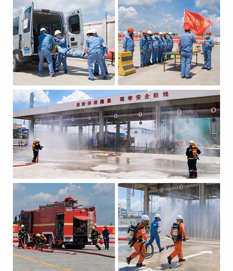 上午10:00,沙田鎮(zhèn)委副書記袁樹堅(jiān)宣布演練正式開始。此次演練現(xiàn)場模擬移動式壓力容器在裝卸臺進(jìn)行丙烷充裝時(shí)發(fā)生大量泄漏,一名充裝員工凍傷,因泄漏量大無法靠近,其他員工立即將受傷員工轉(zhuǎn)移至安全區(qū)域,并先后啟動裝置級、公司級事故應(yīng)急救援預(yù)案,公司領(lǐng)導(dǎo)接報(bào)后立即趕往事故現(xiàn)場,成立現(xiàn)場指揮部,生產(chǎn)處置組、疏散組、警戒組、救援組、消防組、后勤組、工程搶險(xiǎn)組等按照各自的應(yīng)急處置職責(zé)迅速開展救援工作。