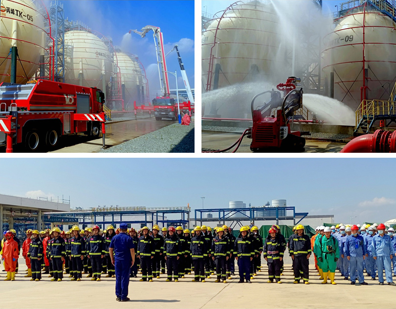 演練模擬設(shè)定在上午9時(shí),巨正源科技公司碳四TK-09號球罐罐底排余管道法蘭墊破損,造成大量丁烷、異丁烷泄漏,沉積在球罐底部區(qū)域,由于靜電作用發(fā)生爆燃,碳四TK-09號球罐泄漏點(diǎn)不可控燃燒,情況十分危急。巨正源科技公司立即啟動應(yīng)急預(yù)案,公司領(lǐng)導(dǎo)趕往事故現(xiàn)場,指揮應(yīng)急小組迅速開展應(yīng)急處置。東莞市消防救援支隊(duì)指揮中心接到報(bào)警后,立即調(diào)派濱海灣新區(qū)、沙田及周邊鎮(zhèn)區(qū)大隊(duì)共20車90名指戰(zhàn)員趕赴現(xiàn)場處置,投用了遙控消防機(jī)器人、遠(yuǎn)程供水車、舉高噴射消防車等裝備開展應(yīng)急處置。同時(shí),濱海灣新區(qū)大隊(duì)接警值班室通知立沙島島上企業(yè)消防隊(duì)力量、各應(yīng)急聯(lián)動部門到場協(xié)助處置。